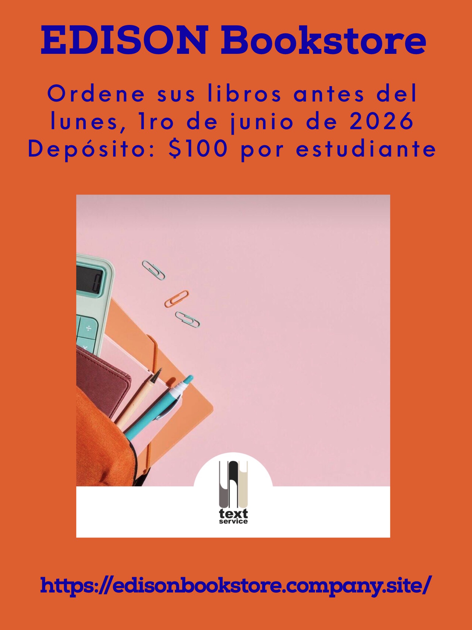 Text Service diseñó EDISON Bookstore exclusivamente para los padres de THOMAS ALVA EDISON SCHOOL. Los padres ahorran tiempo y energía evitando moverse de una librería a otra en la búsqueda de sus libros. En esta página web fácil y conveniente, los padres seleccionarán el grado del estudiante y comprarán según la Lista de libros 2026-27.